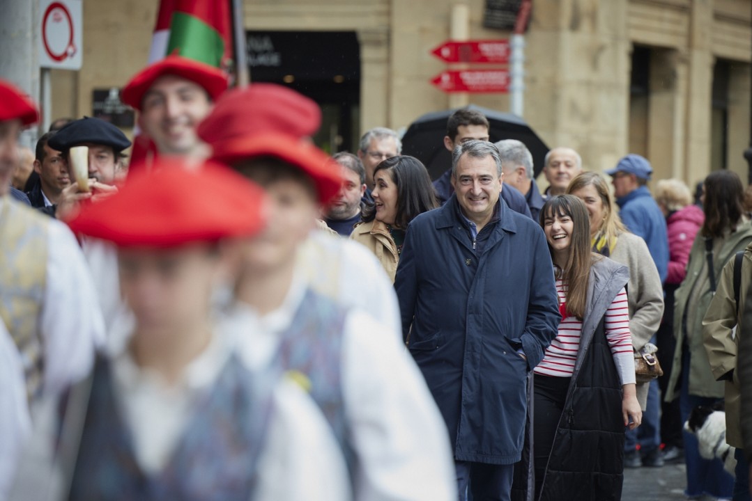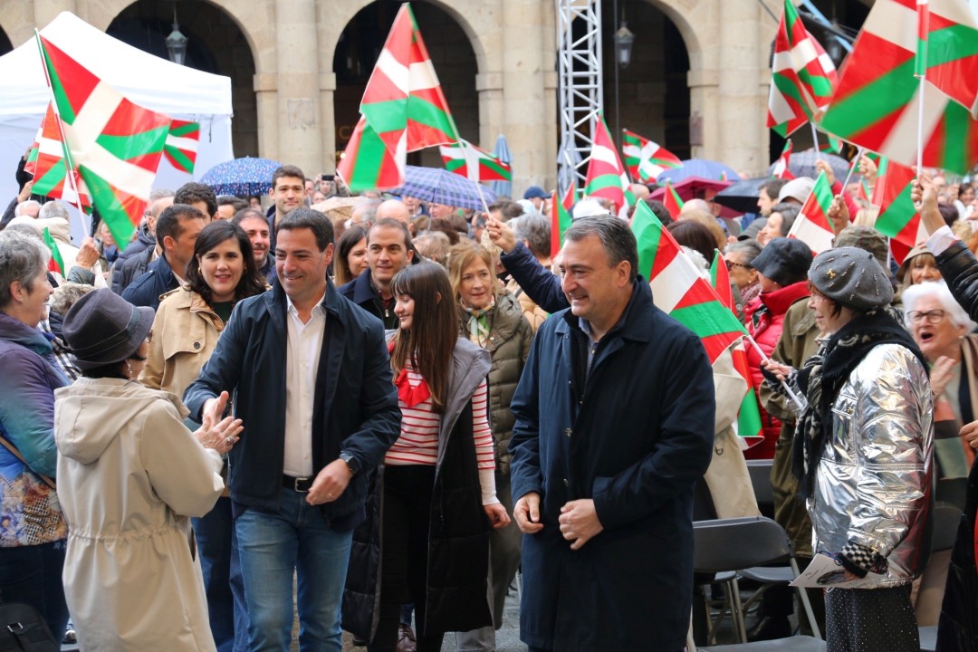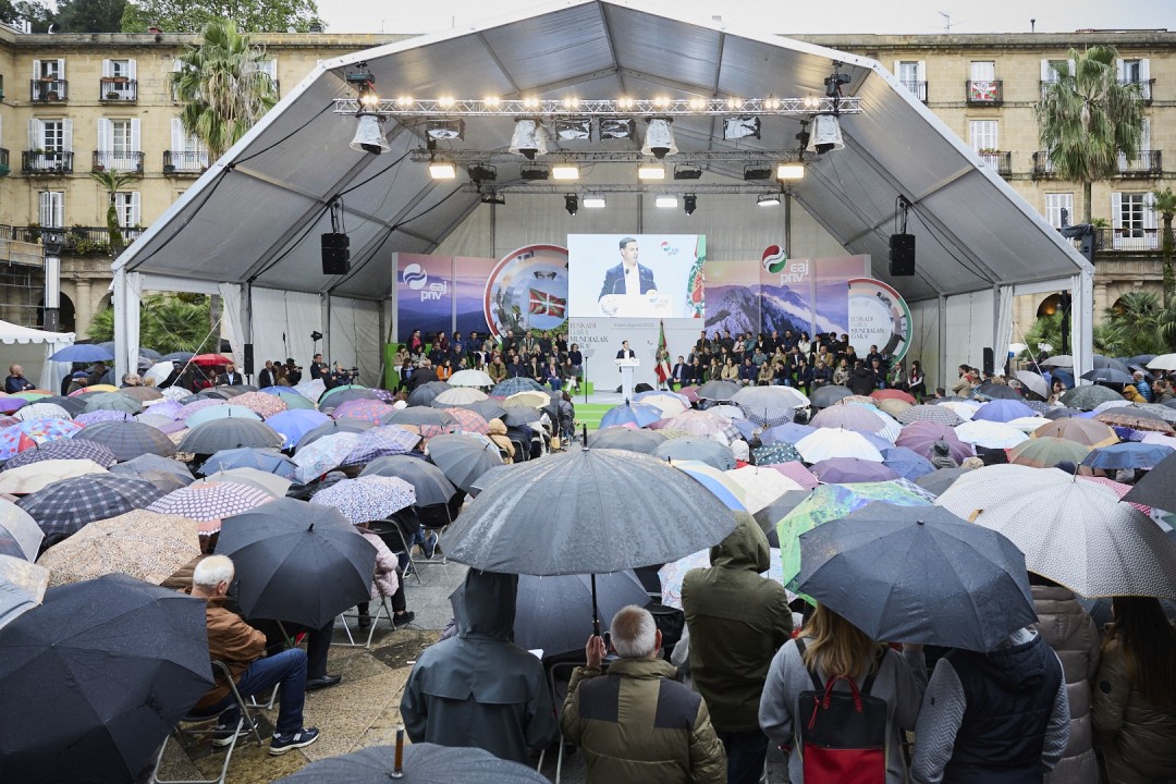 EBBren buruak eta Pradales Lehendakariak hitza hartu dute gaur, hurrenez hurren, Alderdia eta Eusko Jaurlaritza lideratzeko aukeratuak izan zirenez geroztik egokitu zaien lehen Aberri Egunaren kariaz, Bilboko Plaza Barria txiki utzi duten herritarren aurrean